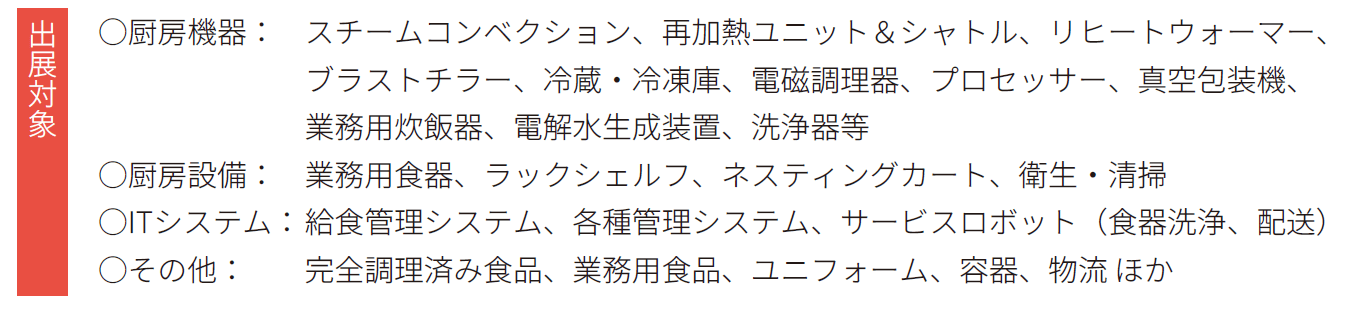 ●来場対象:病院・介護施設経営者、マネジメント層、管理栄養士・調理師、給食会社、設計事務所・建設会社・コンサルタント、食材食品メーカー ほか